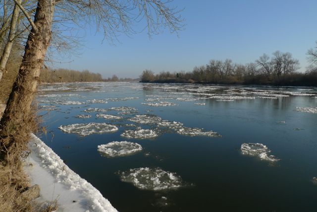 Ci-dessous, la Loire qui charrie des glaces le dimanche 12 février 2012. Même constat en janvier 2017. Et, comme l’énonçait le vieux dicton des pêcheurs de Loire qui faisaient les campagnes de pêche du saumon, alose et lamproie au 19ième siècle sur leur toue (bateau à fond plat) : « Des sables l’été, des glaces l’hiver » ! En effet, le proverbe s’est encore vérifié dernièrement avec une sécheresse mémorable lors des étés 2011, 2016 et 2019, avec un niveau d’eau très bas laissant apparaître d’immenses bands de sable et des glaces charriées les hivers 2012, 2017 et peut-être aussi en 2020 ?